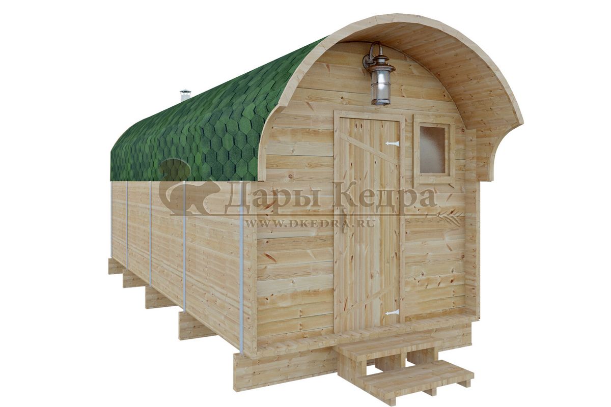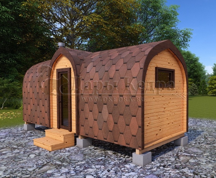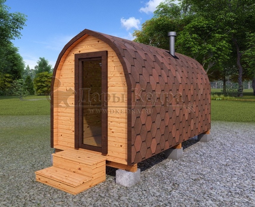 Баня-бочка буханка из кедра 3,5 метра Это более просторная модель за счет увеличенной высоты потолков и ровного пола. В такой модели раздевалка совмещена с моечной. Тут установлен душевой поддон, вешалка, полочка и лавочка из кедра. В парильном отделении по обе стороны расположены двухуровневые открытые полки, печь находится между ними у дальней стены. Время растопки такой бани не превышает 30 минут. По вашему желанию баню-бочку можно укомплектовать козырьком, верандой и печью с внешней загрузкой, благодаря которой весь мусор во время топки остается на улице. Баня-бочка буханка не требует полноценный фундамент, поэтому при необходимости ее можно перенести в другое место. Обращаем Ваше внимание, что в стандартную комплектацию бани входят полки открытого типа в парной с обеих сторон. Дополнительно можно заказать полок закрытого типа или лавку! Кедр обладает ароматическими свойствами. Он не деформируется и влагоустойчив, при правильном уходе за деревом на нем не развиваются грибки и плесень.