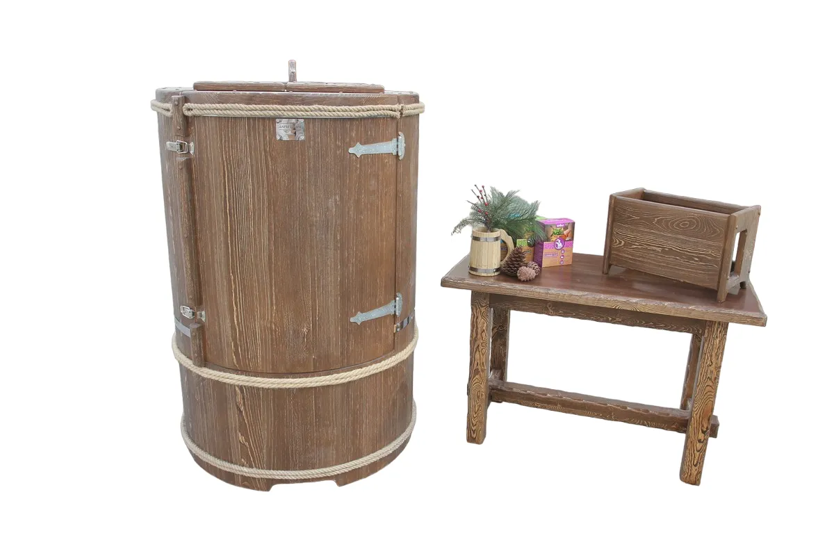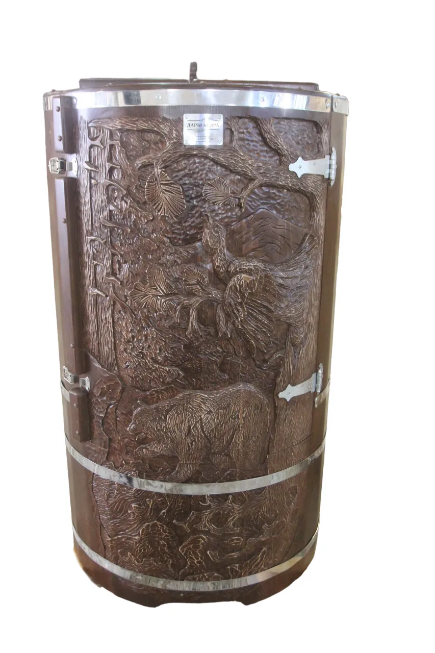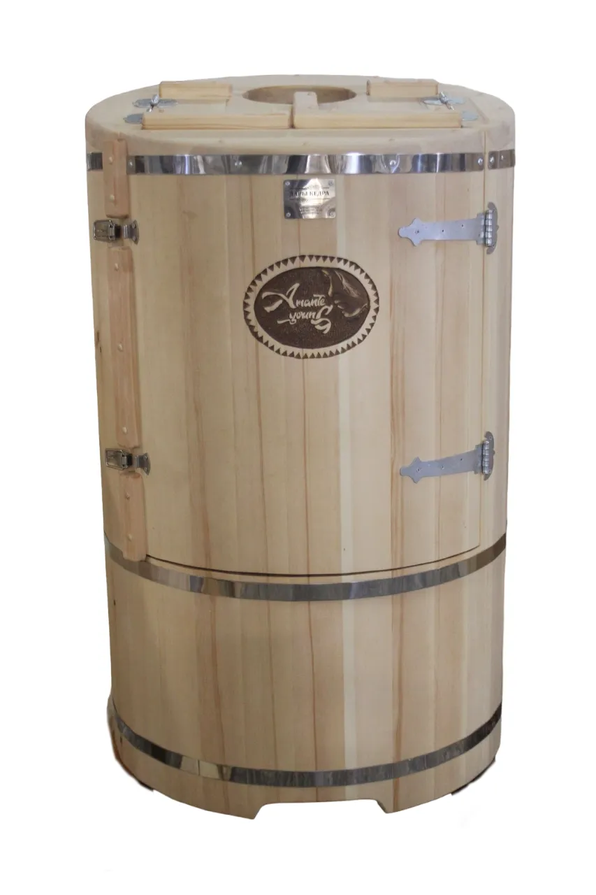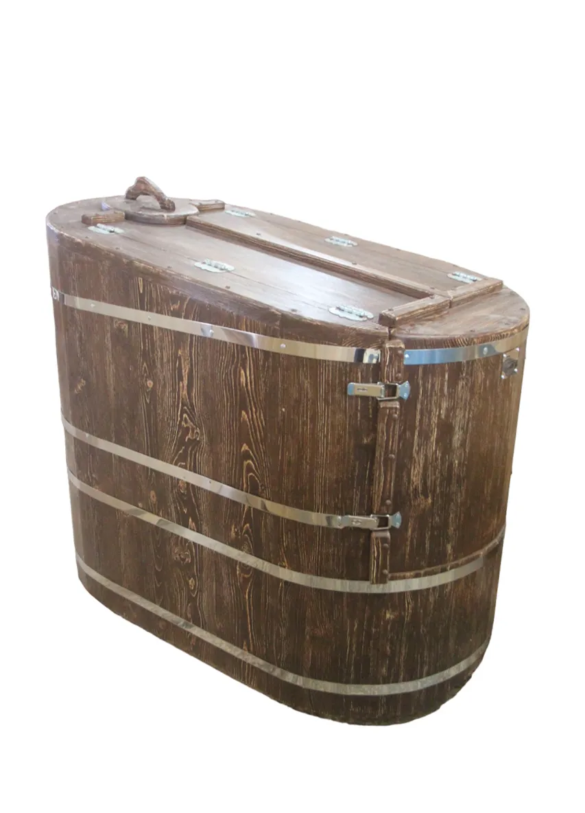 Двухместная фитобочка из кедра - это парная, в которой удобно принимать процедуры двум людям. Она оборудована откидными створками, дверцей, отверстием для головы и перегородкой (по желанию). Толщина стенок составляет 25 мм. Во время парения человек находится внутри кедровой бочки, а голова снаружи. Благодаря этому исключается возможность перегрева. Подлокотники из кедра и внутренние ручки делают эксплуатацию фитобочки более удобной.