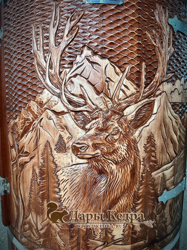 Кедровая бочка (фитобочка) «Лесной Олень» Любая модель эксклюзивной фитобочки - это выбор не только дизайнеров и ценителей красоты, но и тех, кто любит нестандартный подход в любых деталях. С оригинальной авторской фитобочкой Дары Кедра ваша квартира, дом или салон красоты станут объектом всеобщего внимания, ведь такая фитобочка - это не просто смело, красиво и достойно, это еще и очень полезно для Вашего здоровья! Художественная резьба это ручная работа, выполняется разными мастерами и каждый рисунок неповторим. Вы можете выбрать предложенные варианты резьбы или подобрать изображение и мы предложим вам подходящий эскиз. На сайте представлены наши работы в качестве примера. Каждая резьба рассчитывается индивидуально и может быть нанесена на любую модель фитобочки. Эксклюзивная фитобочка может быть представлена в разной цветовой гамме: После того, как цвет фитобочки выбран, необходимо определиться с вариантом резьбы (или предложить свой): Фитобочку можно также декорировать канатной веревкой в места обручей из нержавеющей стали (оплачивается дополнительно).