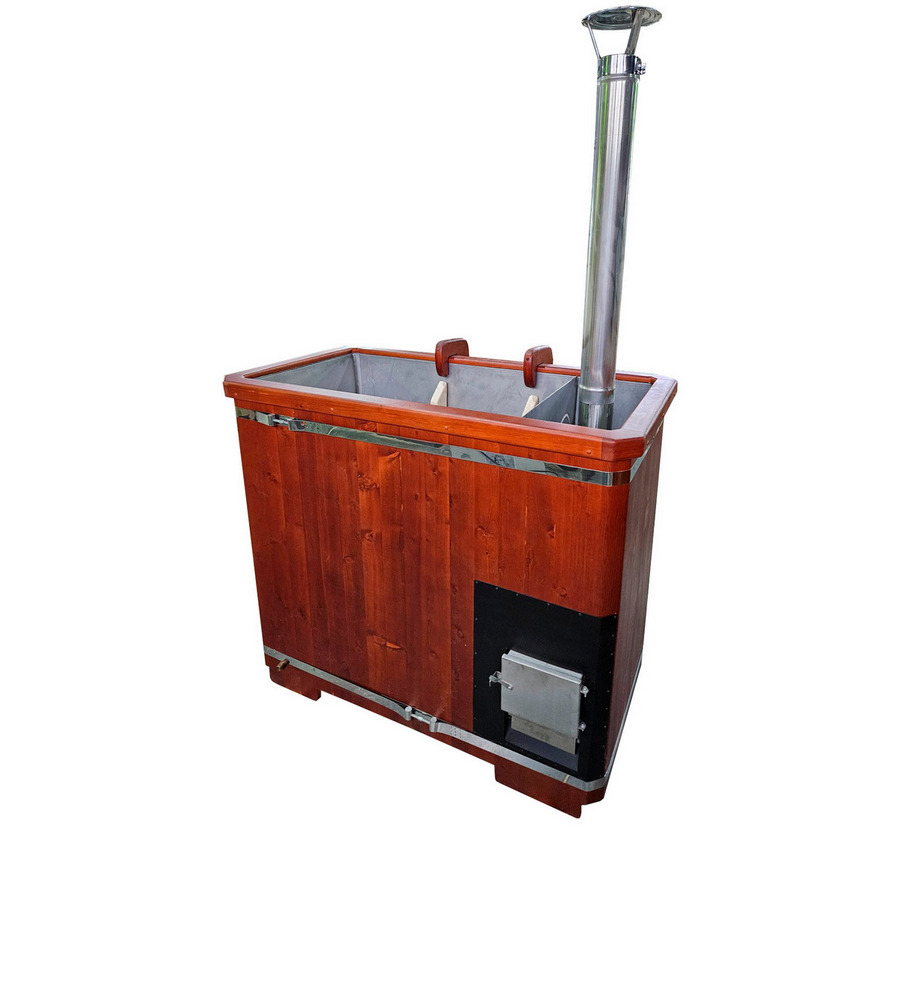 • Фурако прямоугольная с металлической вставкой и встроенной печью Фурако со встроенной металлической чашей, печью и внешней отделкой из массива кедра - это уличная баня, которой можно пользоваться круглый год. Купель представляет собой прямоугольную емкость для воды, внутри которой располагается сиденье и трап для ног из кедра. Нагрев воды происходит за счет встроенной печи, которая находится внутри купели за перегородкой. Рекомендуем приобрести термокрышку и весло для перемешивания воды для ускорения нагрева. Для удобства пользования японская баня фурако с металлической вставкой оборудована внешней и внутренней лестницей из кедра.