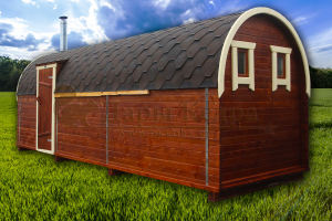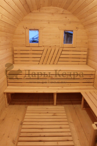 Это самая просторная модель бани. Благодаря этому ее можно использовать не только по назначению, но и в качестве летнего домика. Боковой вход у такой модели находится в начале или в середине конструкции. Моечная оснащена душевым поддоном. Двухуровневый открытый полок и лавочка в парилке сделает принятие процедур более комфортным. По вашему желанию баню-бочку можно дополнить печью с внешней загрузкой, благодаря которой весь мусор после топки останется на улице. Баня-бочка буханка из кедра с боковым входом не требует полноценный фундамент, поэтому при необходимости ее можно перенести в другое место.