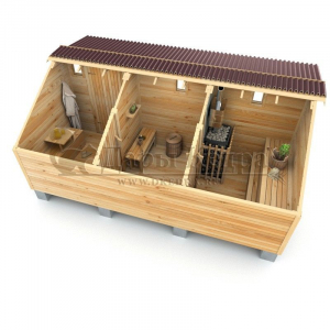 Это классическая прямоугольная модель бани с тремя отделениями: предбанником, моечной и парилкой. Для удобства пользования предбанник оснащен лавочкой и вешалкой. В моечной находится лавка и полочка из кедра. Парилка оборудована двухуровневым открытым полком и печью. Время растопки такой бани не превышает 30 минут. На просторной веранде можно оставить вещи или отдохнуть после парения. Каркасно-щитовую баню можно заказать как в готовом, так и в разборном варианте. В разборной модели готовые щиты из кедра быстро собираются в полноценное строение, что также позволяет исключить лишний строительный мусор. Такая баня не требует полноценный фундамент, поэтому при необходимости ее можно перенести в другое место.