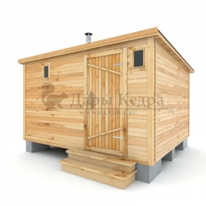 Это квадратная классическая модель бани с тремя отделениями: предбанником, моечной и парилкой. Для удобства пользования предбанник оснащен лавочкой и вешалкой. В моечной находится лавка и полочка из кедра. Парилка оборудована двухуровневым открытым полком и печью. За счет небольших размеров баня нагревается не более 30 минут. Каркасно-щитовую баню можно заказать как в готовом, так и в разборном варианте. В разборной модели готовые щиты из кедра быстро собираются в полноценное строение, что также позволяет исключить лишний строительный мусор. Такая баня не требует полноценный фундамент, поэтому при необходимости ее можно перенести в другое место.