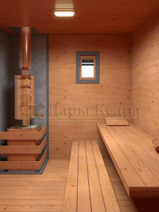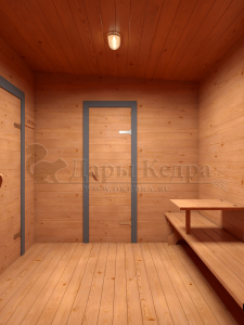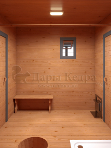 Это классическая прямоугольная модель бани с тремя отделениями: предбанником, моечной и парилкой. Для удобства пользования предбанник оснащен лавочкой и вешалкой. В моечной находится лавка и полочка из кедра. Парилка оборудована двухуровневым открытым полком и печью. Время растопки такой бани не превышает 30 минут. Каркасно-щитовую баню можно заказать как в готовом, так и в разборном варианте. В разборной модели готовые щиты из кедра быстро собираются в полноценное строение, что также позволяет исключить лишний строительный мусор. Такая баня не требует полноценный фундамент, поэтому при необходимости ее можно перенести в другое место.