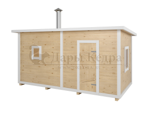 Классическая щитовая баня под ключ из кедра 4 на 2 метра, с двумя отделениями, предбанником и парной. время растопки такой бани не превышает 30 минут.