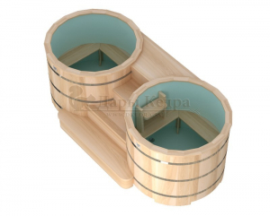 Купель представляет собой две круглые емкости для воды с пластиковыми вставками, в которых люди отдыхают после парения. Между купелями установлен широкий подиум из кедра, по которому могут спускаться и подниматься сразу несколько человек. Для комфортного отдыха купель оснащена лавочками и двумя внутренними лестницами.
