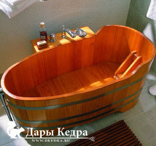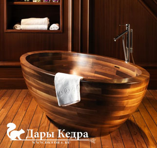 • Кедр не зря используют при судостроительстве. Древесина твёрдой породы отличается красивой структурой и благородным оттенком. Она не подвержена гниению, выдерживает долгое воздействие влаги и температуры. Практически не даёт усадки, не коробится и не трескается. Поэтому ванна при правильном уходе прослужит вам много лет.